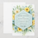 This design features a beautiful watercolor arrangement of wildflowers. Soft sky blue and cheerful yellow blossoms are nestled amongst delicate pale green leaves. The painterly style creates a fresh, airy, and romantic atmosphere perfect for a spring or summer matrimonial occasion. This botanical composition is elegant and charming.