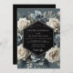 This opulent design evokes a moody, romantic atmosphere with deep slate blue and cream roses. Lush, dark foliage surrounds the blooms, creating a dramatic and elegant visual. The intricate floral arrangement suggests a sophisticated, artistic theme.