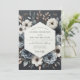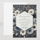 An enchanting floral design features deep slate blue and ivory blossoms with subtle hints of copper foliage. The moody atmosphere evokes a sense of romantic mystique.