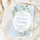 Make your special day unforgettable with this elegant watercolor wedding invitation, thoughtfully designed to shine with Zazzle’s premium print quality. Featuring soft pastel blue hydrangeas, delicate eucalyptus and greenery foliage, and a refined gold glitter oval frame, this invitation blends timeless romance with modern sophistication.