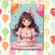 Jolie fille d'anime rose et turquoise avec gâteau d'anniversaire et ballons d'invitations d'anniversaire à thème. Arrière - plan rose, bleu floral.