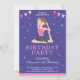 Éblouissez vos invités avec cette invitation de fête d'anniversaire mignonne avec une adorable petite fille faisant du yoga contre un arrière - plan périwinkle. Ajoutez simplement les détails de votre événement sur ce modèle facile à utiliser pour en faire une invitation unique. Retournez la carte pour révéler un motif rayé rose et blanc au dos de la carte.