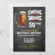 Un mélange de rustique et de style moderne du milieu du siècle, invitation d'anniversaire, avec une touche de grunge moderne. Un thème "Cheers and Beers" avec un grand verre de brasserie, et deux steins de bière à l'arrière. Le texte est personnalisable.