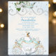 This whimsical and enchanting birthday party objets a Cendrillon Fairy Tale theme. A pompe style princess carriage with teal and gold glitter accents is placed at the bottom. A diamond floral border at the top has a matching teal and gold princess crown on top. Glitter diamonds accent the top and bottom.