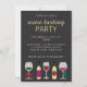Cette invitation à la dégustation de vin moderne et élégante présente un arrière - plan noir et un texte de couleur or et argent. Le bord inférieur de l'invitation est bordé de bouteilles de vin et de verres de vin rouge, vert et rose. Nous avons utilisé l'art de http://revidevi.etsy.com .