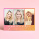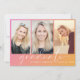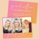 Invitation à la fête de remise des diplômes tendance avec un arrière - plan dégradé rose à orange, trois photos de la grade, "diplômée" dans un script blanc chic et son nom et année de classe dans une simple typographie blanche moderne. Ajoutez les détails de votre fête à l'arrière.