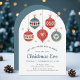 Soirée de Noël Chic Ornament Noël Invitations présente des ornements de Noël festifs en rouge et bleu entourés de flocons de neige dorés tombants. Customisez avec vos détails d'invitation pour le dîner du soir de Noël aligné sur le centre, agrémenté de "Christmas Eve" dans un script de calligraphie bleu chic. Sur l'envers des invitations est bleu solide. Créé par Evco Holidays www.zazzle.com/store/evcoholidays