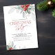Invitation de Noël moderne avec élégante verdure d'hiver et baies sur un arrière - plan blanc accentué par le texte de style manuscrit tendance blanc.