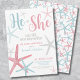 Moderne rose et bleu Il ou Elle Summer Beach Genre Reveal Party Invitation. Bienvenue amis et la famille des parents à une fête d'été ou de plage sur le thème du genre révéler la fête pour savoir si le couple a un garçon ou une fille! Un motif de plage aux étoiles de mer, mignon et branché, aux tons roses et bleus ou turquoises envoûtants, qui évoque un paradis de maison de plage. Découvrez l'essence de l'été avec ce design d'inspiration côtière, orné d'étoiles balnéaires fantaisistes qui dégagent un charme marin. Disponible sous forme d'invitation imprimée ou d'invitation numérique téléchargeable que vous pouvez envoyer par e-mail ou avoir imprimé localement !
