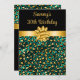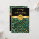 Cette invitation à la fête d'anniversaire élégante et glamour comporte un arc d'or et un ruban avec des taches d'empreinte de léopard vert et or. Le texte combine écriture manuscrite et polices sans serif modernes pour un look élégant et sophistiqué.
