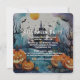 Invitation à la fête d’Halloween avec une aquarelle illustrant des fioles de valet éffrayant, des chauves-souris et un manoir hanté.