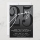 Célébrez vingt-cinq ans d'amour avec cette invitation moderne pour les 25 ans de mariage. Le design présente un fond gris élégant avec un dégradé noir subtil pour un look intemporel et élégant, le gris symbolisant l'argent, le métal officiel de cet anniversaire de mariage. Un grand "25" noir s'étend sur la majeure partie de la carte, avec un "Vingt-Cinq" blanc de style manuscrit superposé pour un contraste saisissant. Les détails de la fête sont soigneusement disposés en bas dans une police sans serif claire, ce qui maintient la mise en page minimaliste et sophistiquée.