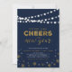 Fêtez le premier jour de la nouvelle année avec cette invitation de la fête du Nouvel An moderne. Cette conception comprend la typographie "Cheers to the new year", des flocons de neige en faux or et des lampes à cordes sur un arrière - plan bleu marine. Vous pouvez personnaliser le texte et la couleur arrière - plan.