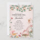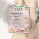 Cette invitation personnalisée présente un thème de fête Enchanted Garden. L'arrière - plan est un rose pâle, avec des images magiques de champignons, de fleurs et d'une jolie petite fée. Les lanternes et les lumières de fées accentuent les branches sur la partie supérieure.
