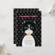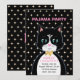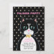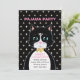 Carte d'invitation pour une fête d'anniversaire en pyjama avec un charmant chat smoking comme messager et des étoiles sur fond noir. Tout le texte est prêt à être personnalisé.