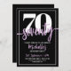 Voici une invitation simple et moderne à la fête du 70e anniversaire, parfaite pour célébrer ce jalon dans le style. Le design épuré présente un arrière - plan noir audacieux avec un "70" en haut. Ci-dessous, "Soixante-dix" est élégamment écrit en calligraphie script, ajoutant une touche de sophistication. Le texte de l'invitation combine un mélange de polices simples modernes et de polices de caractères en violet et blanc, créant un contraste saisissant sur le fond noir. Un cadre blanc et épuré autour du bord complète le design avec une touche d'élégance. Cette invitation est idéale pour une célébration chic et élégante du 70e anniversaire. La couleur, les polices et le cadre arrière - plans peuvent tous être customisés pour correspondre à votre style. Invitation Moderne 70ème Anniversaire Black Et Lilac Purple Bold Style Seventieth Celebration. Disponible sous forme d'invitation imprimée ou d'invitation numérique téléchargeable que vous pouvez envoyer par e-mail ou avoir imprimé localement !
