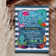 C'est une fille ! Super mignon, amusante vie de mer, thème nautique fille invitation baby shower sur bandes bleu et blanc de minuit avec des couleurs vives. Les créatures marines colorées, aquatiques et caricaturales comprennent l'aqua et le poulpe jaune, la tortue de mer verte et orange, le poisson rose, le dauphin turquoise, l'hippocampe orange, le crabe rose clair et le corail orange et rose au fond de l'océan. Les fontes amusantes semblent flotter sous l'eau avec des bulles sous l'océan dans l'arrière - plan.