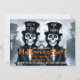 Dapper Spirits & Fogbound Fright Halloween Party Invitation Une invitation Halloween affinée avec deux hôtes squelettiques en tenue noire formelle, avec chapeaux hauts et yeux bleus brillants. Dans un décor plein de brumes et d'ombre, le design évoque le charme gothique et la sophistication spectrale. Parfait pour donner le ton d'une soirée mystérieuse, avec un nom et des détails personnalisables qui correspondent à votre propre rassemblement fantomatique.