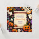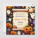 Le design comporte un défilement de parchemin vieilli au centre, offrant un espace vide pour le texte. Autour du parchemin se trouvent diverses icônes sur le thème de l'Halloween, dont des lanternes crêpes souriantes, des fantômes à différentes expressions, du maïs-bonbons, des lollipops de couleur Halloween, des araignées noires et des chauves-souris. L'arrière - plan est un violet profond avec des motifs étoiles subtils, créant une atmosphère ludique et éffrayante parfaite pour une invitation à Halloween.