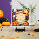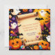 Le design comporte un défilement de parchemin vieilli au centre, offrant un espace vide pour le texte. Autour du parchemin se trouvent diverses icônes sur le thème de l'Halloween, dont des lanternes crêpes souriantes, des fantômes à différentes expressions, du maïs-bonbons, des lollipops de couleur Halloween, des araignées noires et des chauves-souris. L'arrière - plan est un violet profond avec des motifs étoiles subtils, créant une atmosphère ludique et éffrayante parfaite pour une invitation à Halloween.