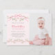 Cette invitation photo de premier anniversaire présente une bordure florale rose et verte ornée de papillons et de rubans. Pour une personnalisation plus avancée de cette conception, cliquez sur le BOUTON OUTIL DESIGN BLEU ci-dessus !