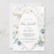 Cette invitation généreuse à la verdure et à l'arrosage de bébé en feuille d'or est parfaite pour un baby shower moderne. L'élégant design botanique présente des eucalyptus aquarellés clairs et aquarellés, agrémentés de feuilles de parties scintillant en or blanc.