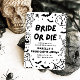 Bride ou Die 💋 💀 🖤 C’est son dernier vol... alors faisons-le fabuleux ! Cette invitation à la fête bachelorette d'Halloween en noir et blanc gothique présente des squelettes dessinés à la main pointus, des détails éffrayants et des illustrations obstinément mignonnes — chauves-souris, toiles de cobaye, fantômes, et plus 🕸️ 🦇. Parfait pour un week-end de sorcière, un voyage déplaisant-chic de filles, ou "Till Death Do Us Party" vibe 🎃 Editable, audacieux et totalement iconique pour votre mariée éffrayante préférée. ⚡ Doit-avoir pour toute équipe de ghoul prête à tuer la nuit ! ⚡