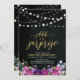 Célébrez une journée spéciale avec cette invitation à l'anniversaire d'anniversaire fleuri et rustique. Ce design présente des lettres élégantes "shhh C'est une surprise" avec des lampes à cordes et un bouquet de fleurs sur un arrière - plan de texture de tableau noir. Vous pouvez customiser le texte à n'importe quel âge ou événement (30ème, 40ème, 50ème, 60ème, 70ème anniversaire, etc). D'autres invitations assorties et fournitures de fête sont disponibles dans ma boutique BaraBomDesign.