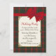 Élégante invitation à la fête de Noël faite dans le traditionnel motif en plaid de clan de Stuart vert et rouge, avec un look ancien or orné d'ivoire encadré. Des graphiques d'un arc et d'un ruban en satin rouge ornent le haut de l'invitation. Personnalisez le texte rouge et noir pour répondre aux besoins de votre parti.