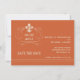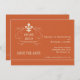 Annoncez vos plans de mariage à vos amis et famille avec ces cartes Save the Date Fleur de Lis de style rétro élégant. La carte présente un design de symbole Fleur de Lis élégant avec de la place pour ajouter votre date de mariage. La carte indique "save the date" dans une impression blanc cassé de style rétro. Personnalisez avec vos noms et date de mariage. Montré ici sur un fond orange brûlé.