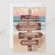Invitations romantiques de mariage océanique avec une plage de sable fin et de soleil luxuriante, lumières scintillantes à cordes et votre libellé écrit sur un panneau en bois rustique.