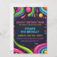 Une invitation d'anniversaire vibrante et ludique présentant un design inspiré de la psychédélie et du rétro. Le fond sombre est décoré de formes colorées tourbillonnantes, de lignes abstraites et de gouttes de couleur vibrantes rappelant les années 1970. La bordure est un motif amusant de visages souriants multicolores, avec des étoiles et des bulles dispersées dans tout le design. Le texte est dans un mélange de polices grasses et ludiques, avec des détails clés mis en évidence en bleu clair et rose.