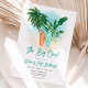 Surf de plage tropical à bord de la grande invitation d'un anniversaire avec palmiers exotiques, illustration d'oiseau de paradis aquarelle et une plage tropicale de destination avec sable et bleu turquoise océan, avec 2 planches de surfs en bois de saumons marron et turquoise avec un script de pinceau cool. Idéal pour l'invitation des enfants du printemps et de l'été