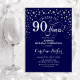 Invitation surprise 90e anniversaire de fête. Design élégant en bleu marine et faux parties scintillant argent. Fonctionne la police de script et les confettis de diamants. Bonjour à 90 ans ! Message-moi si vous avez besoin d'une personnalisation plus poussée.