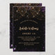 Pour un élégant Sweet 16, 16e anniversaire. Un arrière - plan noir élégant. Décoré avec de la poussière de parties scintillant en faux or violet et des cordes lumineuses dorées. Personnalisez et ajoutez un nom, un âge et des détails de la fête. Le nom est écrit avec un script de style manuscrit