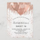 Pour un élégant Sweet 16, 16e anniversaire. Une arrière - plan blanche design. Décoré d'or rose, de gouttes de parties scintillant imitation, de la peinture goutte à goutte et des ballons. Personnalisez et ajoutez un nom, un âge et des détails de la fête. Le nom est écrit avec un script de style manuscrit