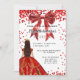 Une invitation moderne, élégante et glamour pour une fête Sweet 16, 16e anniversaire. Un arrière - plan blanc aux étincelles, une robe rouge et un arc rouge. Le nom est écrit avec un script de style moderne écrit à la main. Personnalisez et ajoutez les détails de votre fête.