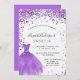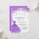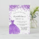 Une invitation moderne, élégante et glamour pour une fête Sweet 16, 16e anniversaire. Sur le devant : Un arrière - plan blanc avec violet, lilas pétille, une robe violette. Le nom est écrit avec un script de style moderne écrit à la main. Personnalisez et ajoutez les détails de votre fête.