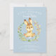 Adorable invitation lapin bébé avec un bébé lapin doux entouré d'une couronne sur un arrière - plan bleu pour une douche bébé garçon. Retournez notre invitation pour voir un retour de coordination pour une touche spéciale supplémentaire.