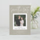 Ce mariage moderne sauvez la date invitation est un design décontracté et réfléchi pour les couples qui veulent annoncer leur fiançailles dans le style. Votre photo fiançailles de choix est avant et centre dans un cadre photo de style instantané et texte personnalisé dans un style manuscrit. Il s'agit d'un mariage entièrement personnalisable sauf le modèle de date dans un beige taupe neutre avec une subtile fausse couche de tissu. Toutes les couleurs et le texte peuvent être changés dans l'outil de conception - faites tous les changements que vous voulez et faites ceci enregistrer les invitations de date uniquement à vous!