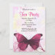 Une invitation à la fête du thé, soignée et élégante. Un beau papillon violet peint qui captive vraiment votre attention. Placez-vous sur un arrière - plan délicat qui a une texture aquarelle unique et créative avec des fleurs romantiques rose et jaune pâle.