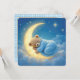Un ours en peluche enveloppé d'une couverture bleue douillette repose sur une lune brillante au croissant, entourée de nuages fluides et d'étoiles scintillantes. Tout le texte peut être modifié.