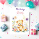 Un doux petit ours en peluche entouré de fleurs roses et violettes aquarelle illustration des invitations de fête d'anniversaire de fille.