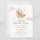 Sur la Lune Baby shower neutre de genre Invitation présente une jolie illustration d'un ours en peluche reposant sur une lune jaune, avec un élégant traitement de type script. Personnalisez-le avec les détails de votre événement. Une belle invitation, parfaite pour votre événement !