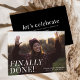 Invités Invitations à votre fête avec nos invitations de la fête de remise des diplômes de Fini Terminé. Les invitations de la fête de remise de diplômes amusants présentent "Enfin fait !" dans une police blanche moderne superposée avec la photo, le nom, l'école et l'année de remise de diplômes du diplômé sur le devant de la scène. Le dos montre "fêtons" et les détails de votre fête en blanc contre un arrière - plan noir.