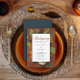 Un bouquet de fleurs éthérées dans les tons blanc, or, orange et rouge foncé d'hiver avec verdure sur un panneau blanc, doré et turquoise foncé bordé d'un arrière - plan orange rouillé invitation vos invités à ce qui est sûr d'être une occasion rustique mémorable "Thanksgiving Dinner" élégant. Le dos est orné d'un arrière - plan turquoise foncé. Conception composite par Holiday Hearts Designs (droits réservés).