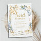 Un élégant terrarium cadre géométrique doré bordure Sweet 16 invitation avec un design en couches dorées de cadres géométriques et de papillons en or (effets numériques) avec le feuillage d'eucalyptus bleu, ainsi que la calligraphie moderne sur un arrière - plan moderne en ivoire. Élégant et chic, il est l'invitation parfaite pour une célébration élégante avec une touche de fantaisie, ou un jardin jardin nuptiale déjeuner, brunch ou fête pour un ado qui aime le boho et les papillons.