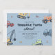 Fêtez la grande journée de votre petit constructeur avec cette Terrible Twos Construction Truck Invitation anniversaire! Doté de véhicules de construction colorés et d'une typographie ludique, cet invitation donne le ton parfait pour une fête de 2ème anniversaire animée et aventureuse. Parfait pour les enfants qui aiment les camions et creuser dans la saleté, ce design est à la fois ludique et dynamique, rendant tout bain d'anniversaire inoubliable.