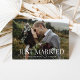 Ces annonces d'élévation mariages, chic et minimaliste, présentent une typographie blanche élégante et originale, comme une superposition qui dit "Marié". Votre photo de mariage préférée se trouve à l'avant de la carte, et il y a de la place pour deux autres sur le dos. Vous pouvez également ajouter un message personnalisé au dos de votre mariage.