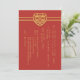 Des lignes épurées modernes et contemporaines avec des éléments de mariage traditionnels chinois, cette invitation de mariage est idéale pour les couples chinois qui se marient ! Le caractère chinois signifiant double bonheur, utilisé pour le bonheur conjugal, est intégré dans une forme de cœur. Le texte jaune doré faux contraste joliment avec le fond rouge. Personnalisez facilement avec vos détails de mariage en texte chinois !